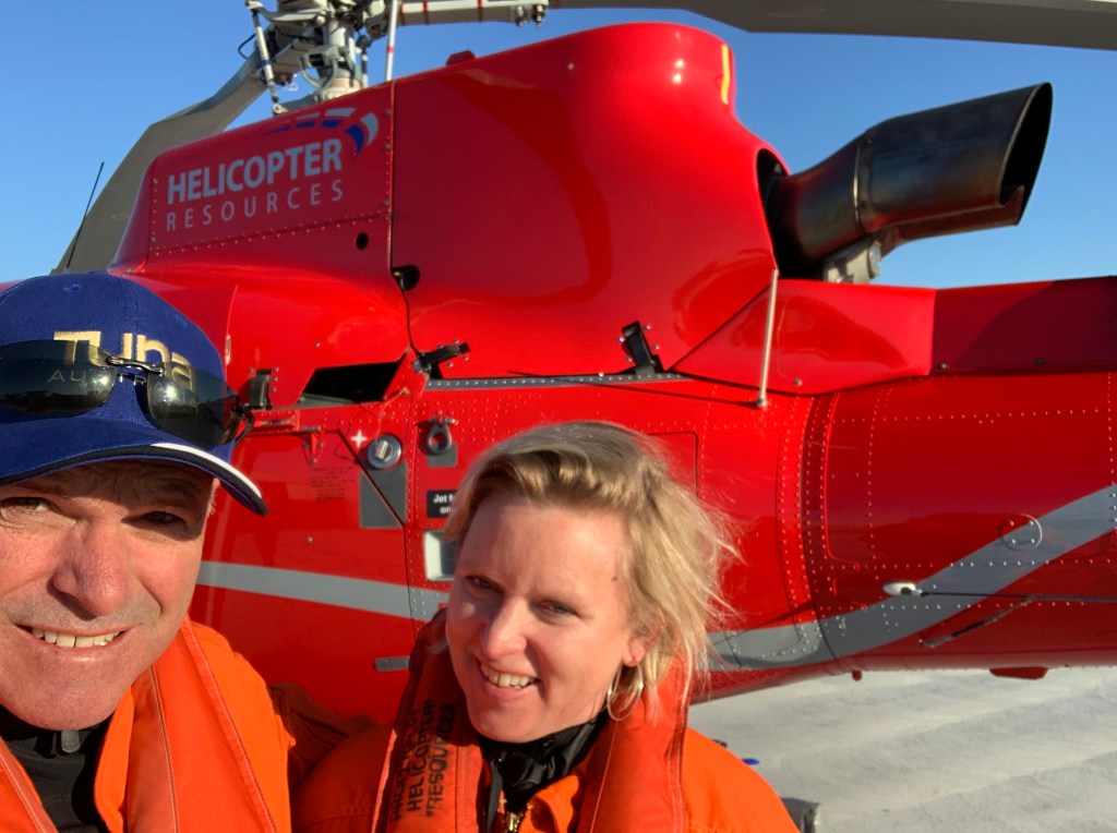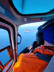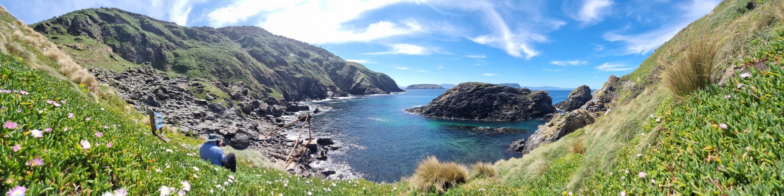 We arrived on Maatsuyker Island on a champagne-clear morning. The hour-long flight in our crimson-shiny helicopter over Tasmania’s South-west World Heritage Area and southern seas was sublimely smooth. Landing on Maatsuyker’s tiny helipad of green, green grass amongst the tea-tree happened all too soon. Blue plastic Nally (fish) bins filled with our 620 kg of clothes, gear, food and provisions (everything we need for eating, sleeping, abluting, living and fun for the next 6 months) followed us in a helicopter sling load. All in perfect order. Not even an egg was cracked.