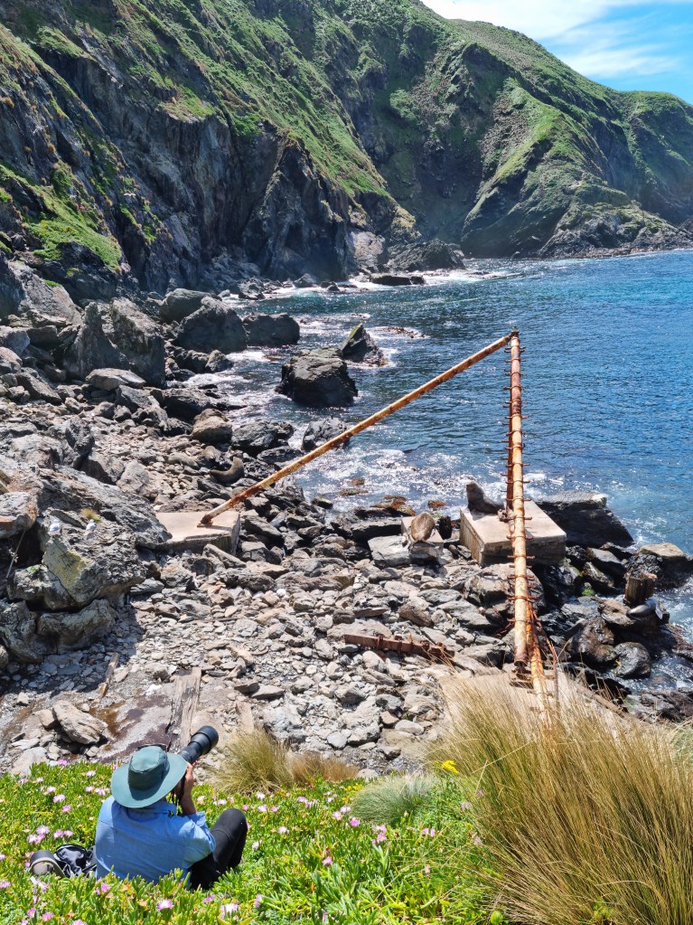 Parts of the tram line remain as well as the whim shed and old iron whim. It is still possible to walk down to where the old jetty was. These days, chains have been bolted to the rocks for anyone clambering up or down the cliff. Fur seals have taken over the few concrete pilings supporting the old crane which is all that remains of the jetty….