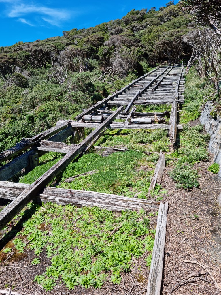 Before construction of the lighthouse or cottages could begin, a huge amount of work was required just to get people and construction materials on to Maatsuyker. A jetty and crane were built at the only site on the island that allows landing – Alomes Gulch where the Nuenonne once camped and their middens remain. From the completed jetty, a track was cut 500m up the steep cliff and a wooden tram line built with a winch house at the top. The poor horses that were used for powering the winch – or whim – had to make their own way up the cliff.