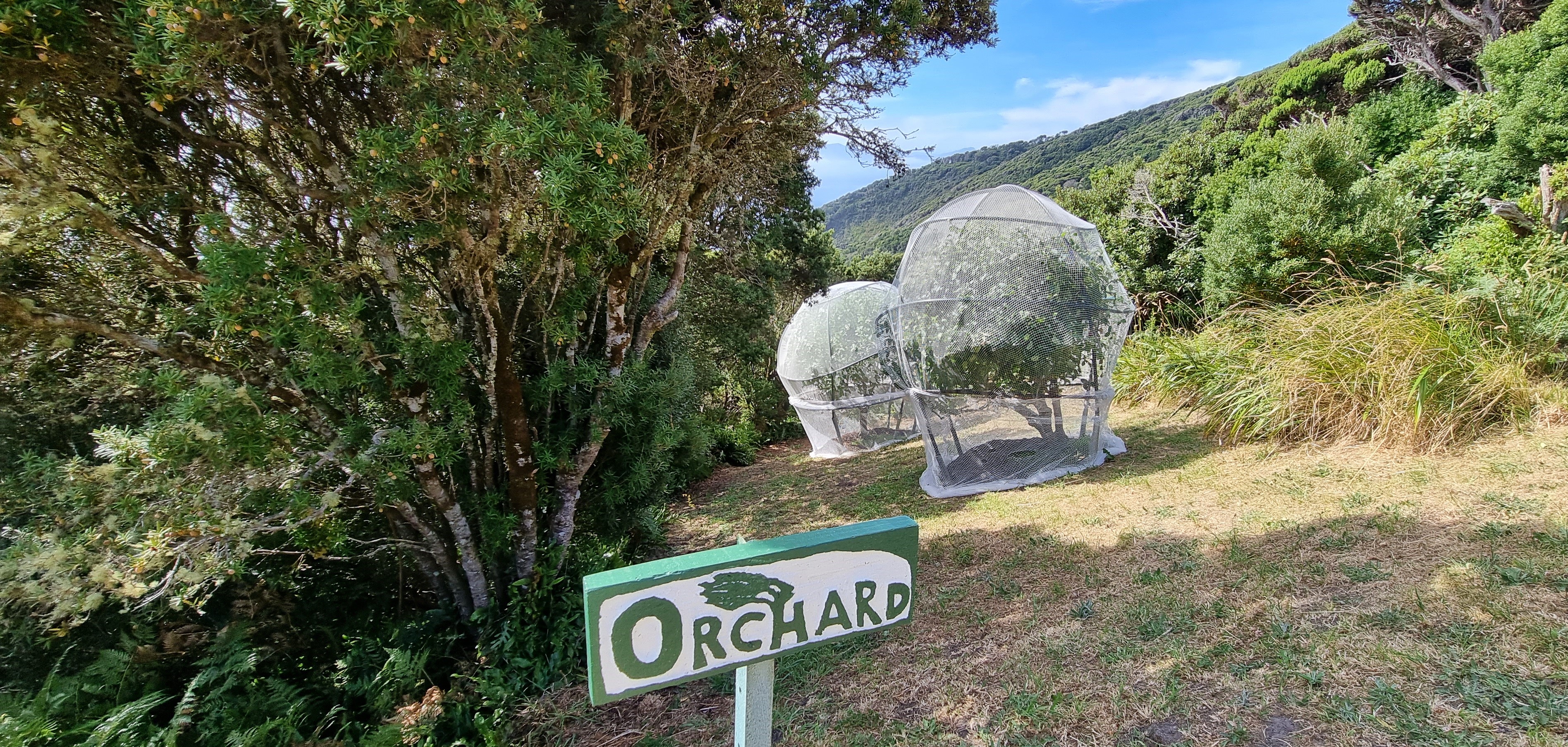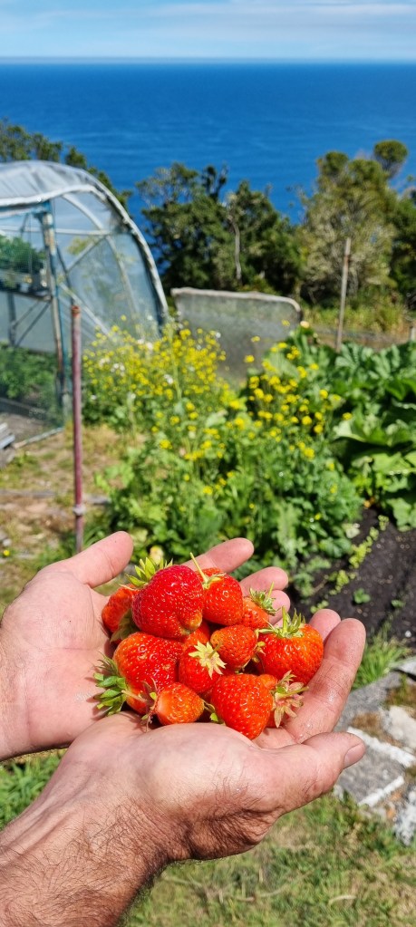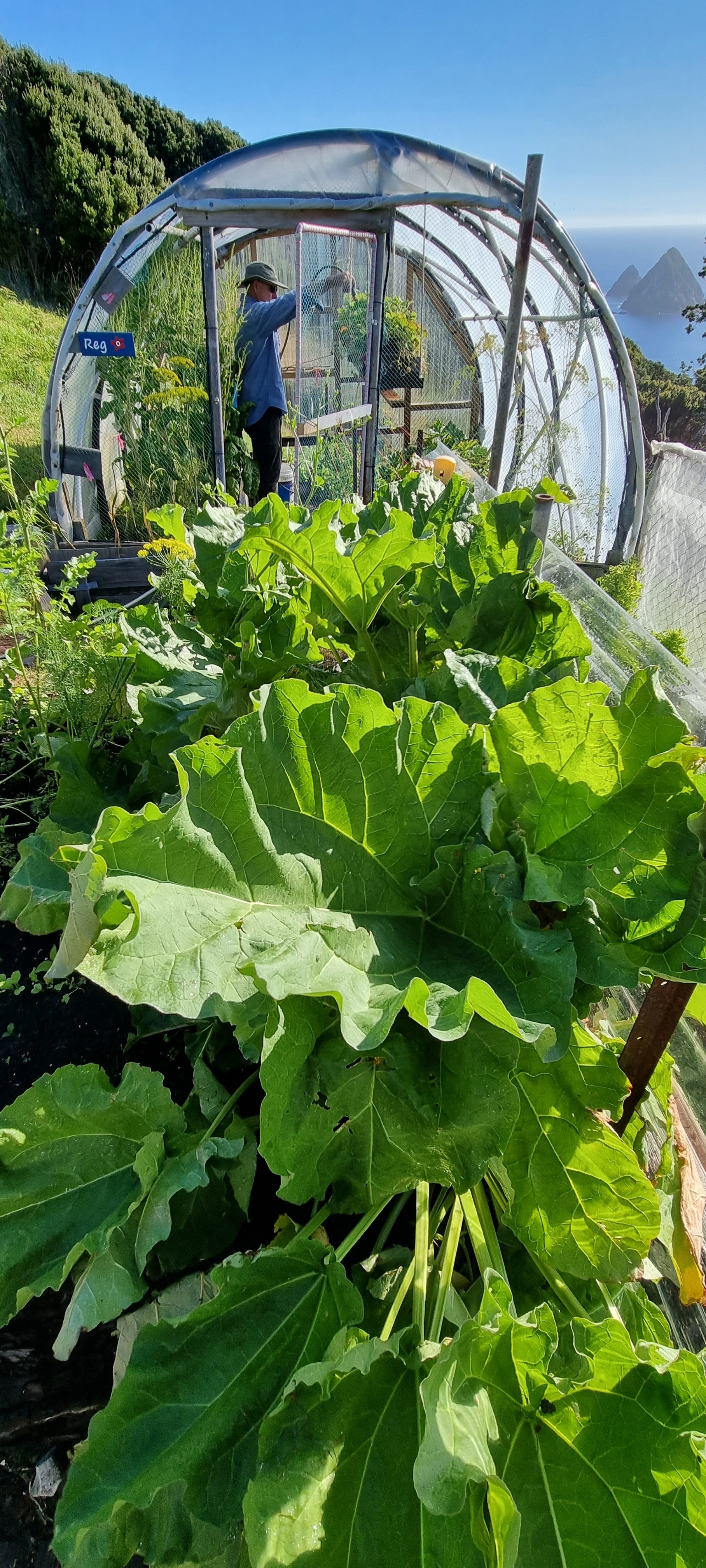 Gardening is an important part of our life on the island as, apart from the heritage potatoes that grow wild here, the gardens are the only source of fresh vegetables and fruit. The main garden with two growing tunnels sits below the track around 500m from our cottage where it is more protected from the wind and receives more rain.